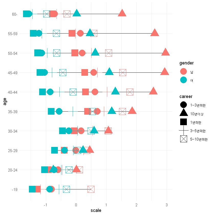 # 표준화 - scale() salary_scale <- scale(df$salary) head(salary_scale)-1.28886999 -0.91757018 -0.38981924 -0.06340878 0.37924689 0.31343053 # 표준화 값 추가 df_scale <- cbind(df, scale=salary_scale) head(df_scale)age salary sepcialSalary workingTime numberOfWorker career gender scale -19 1346534 151840 169.5 15042 1년미만 남 -1.28886999 20-24 1584214 115375 180.1 74251 1년미만 남 -0.91757018 25-29 1922043 268058 178.0 143338 1년미만 남 -0.38981924 30-34 2130988 335710 180.8 103585 1년미만 남 -0.06340878 35-39 2414345 352816 181.4 65385 1년미만 남 0.37924689 40-44 2372214 233728 182.9 55422 1년미만 남 0.31343053 # 시각화 g1 <- ggplot(df_scale, aes(x=scale, y=age)) g2 <- geom_segment(aes(yend=age), xend=0) g3 <- geom_point(size=7, aes(colour=gender, shape=career)) g1 + g2 + g3 + theme_minimal()Warning message: "Removed 2 rows containing missing values (geom_segment)."Warning message: "Removed 2 rows containing missing values (geom_point)."'R' 카테고리의 다른 글
