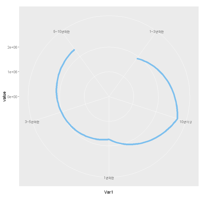 # 그래프로 확인 melt <- melt(temp) melt ggplot(melt, aes(x=Var1, y=value, group=1))+ geom_line(colour='skyblue2', size=2) + coord_polar() + ylim(0, max(melt$value))Var1 value 1~3년미만 1905012 10년이상 2907119 1년미만 1730835 3~5년미만 2028015 5~10년미만 2360463