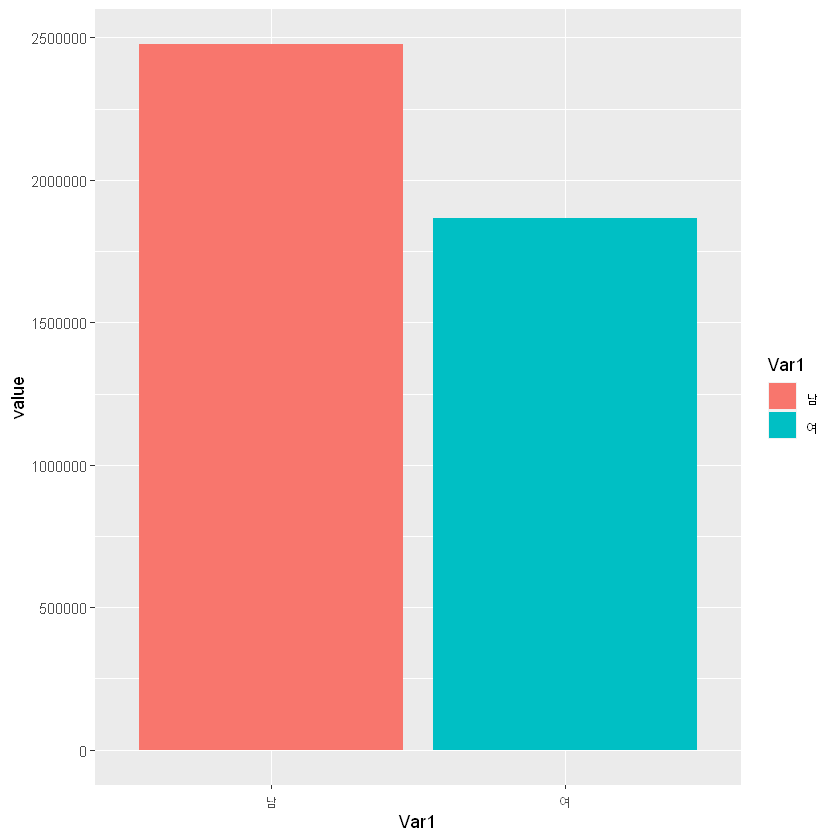 library('reshape2') library('ggplot2') # 재 구조화 그냥 temp로는 그래프 작업 불가 melt <- melt(temp) melt # 그래프로 확인 ggplot(melt, aes(x=Var1, y=value, fill=Var1)) + geom_bar(stat='identity')Warning message: "package 'reshape2' was built under R version 3.6.3"Warning message: "package 'ggplot2' was built under R version 3.6.3"Var1 value 남 2477332 여 1865823