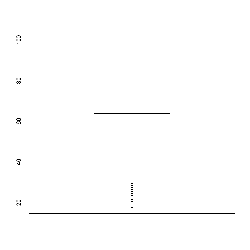 # age 특징확인 summary(df$age)Min. 1st Qu. Median Mean 3rd Qu. Max. 18.00 55.00 64.00 63.51 72.00 102.00# 시각화 boxplot(df$age) # 100세 이상, 30세 이하는 잘 안걸림