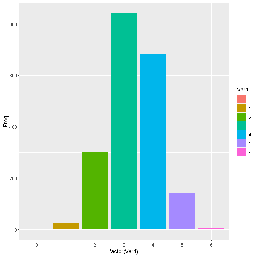 # 확률변수 마다 실제 판매된 제품 넣어서 도수 구하기 rv_table <- table(rv[c]) rv_table0 1 2 3 4 5 6 2 26 302 840 682 142 6addmargins(rv_table, margin = 1)0 1 2 3 4 5 6 Sum 2 26 302 840 682 142 6 2000# 상대적 판매 비율 => 확률 rv_prop_table <- prop.table(rv_table) rv_prop_table0 1 2 3 4 5 6 0.001 0.013 0.151 0.420 0.341 0.071 0.003# 시각화 library(ggplot2) library(ggthemes)rv_df <- as.data.frame(rv_table)rv_dfVar1 Freq <fct> <int> 0 2 1 26 2 302 3 840 4 682 5 142 6 6 ggplot(rv_df, aes(x=factor(Var1), y=Freq, fill=Var1))+ geom_bar(stat='identity')