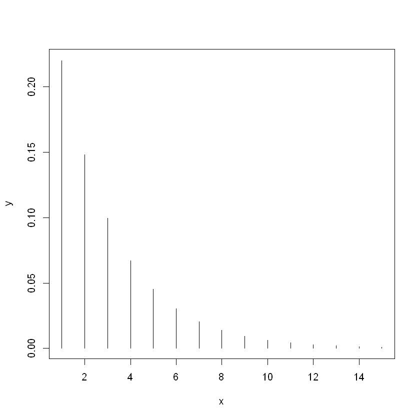 # stage_03 일 때 기하분포 x <- 1:15 y <- dgeom(x, 0.327) plot(x, y, type='h')