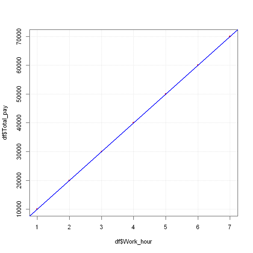 point로 시각화 # 절편 b0과 기울기 b1구하기 - lm(종속변수~독립변수) LR <- lm(data = df, df$Total_pay ~ df$Work_hour) LRCall: lm(formula = df$Total_pay ~ df$Work_hour, data = df) Coefficients: (Intercept) df$Work_hour -3.545e-12 1.000e+04# 회귀선 추가 plot(data = df, df$Total_pay ~ df$Work_hour, pch = 20, col = 'red') grid() abline(LR, col='blue', lwd=2) # lwd : line width