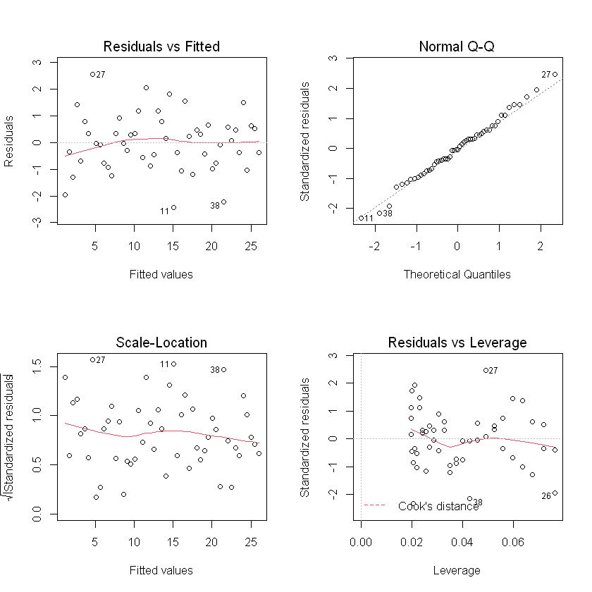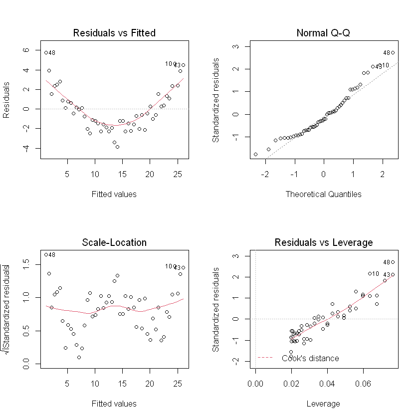 x2, y2의 회귀모델 추가 그래프 # 결정계수와 F통계량 확인 options(scipen = 999) summary(Lm.res1) # Multiple R-squared: 0.9201, p-value: < 0.00000000000000022 => 정상범위Call: lm(formula = y1 ~ x1, data = df) Residuals: Min 1Q Median 3Q Max -3.8603 -1.5588 -0.4486 1.1981 5.7548 Coefficients: Estimate Std. Error t value Pr(>|t|) (Intercept) 1.1552 0.6071 1.903 0.063 . x1 4.9712 0.2093 23.756 <0.0000000000000002 *** --- Signif. codes: 0 '***' 0.001 '**' 0.01 '*' 0.05 '.' 0.1 ' ' 1 Residual standard error: 2.2 on 49 degrees of freedom Multiple R-squared: 0.9201, Adjusted R-squared: 0.9185 F-statistic: 564.3 on 1 and 49 DF, p-value: < 0.00000000000000022summary(Lm.res2) # Multiple R-squared: 0.9802, p-value: < 0.00000000000000022 => 정상범위Call: lm(formula = y2 ~ x2, data = df) Residuals: Min 1Q Median 3Q Max -2.43449 -0.72323 -0.03214 0.59951 2.54498 Coefficients: Estimate Std. Error t value Pr(>|t|) (Intercept) 1.1552 0.2925 3.95 0.00025 *** x2 4.9712 0.1008 49.31 < 0.0000000000000002 *** --- Signif. codes: 0 '***' 0.001 '**' 0.01 '*' 0.05 '.' 0.1 ' ' 1 Residual standard error: 1.06 on 49 degrees of freedom Multiple R-squared: 0.9802, Adjusted R-squared: 0.9798 F-statistic: 2431 on 1 and 49 DF, p-value: < 0.00000000000000022# 잔차 관련 그래프로 확인 # Residuals vs Fittes 그래프 1번 퍼지지 않고 U자로 모여 있음 # Q-Q 선을 따르지 않는 데이터가 많음 par(mfrow = c(2,2)) plot(Lm.res1)