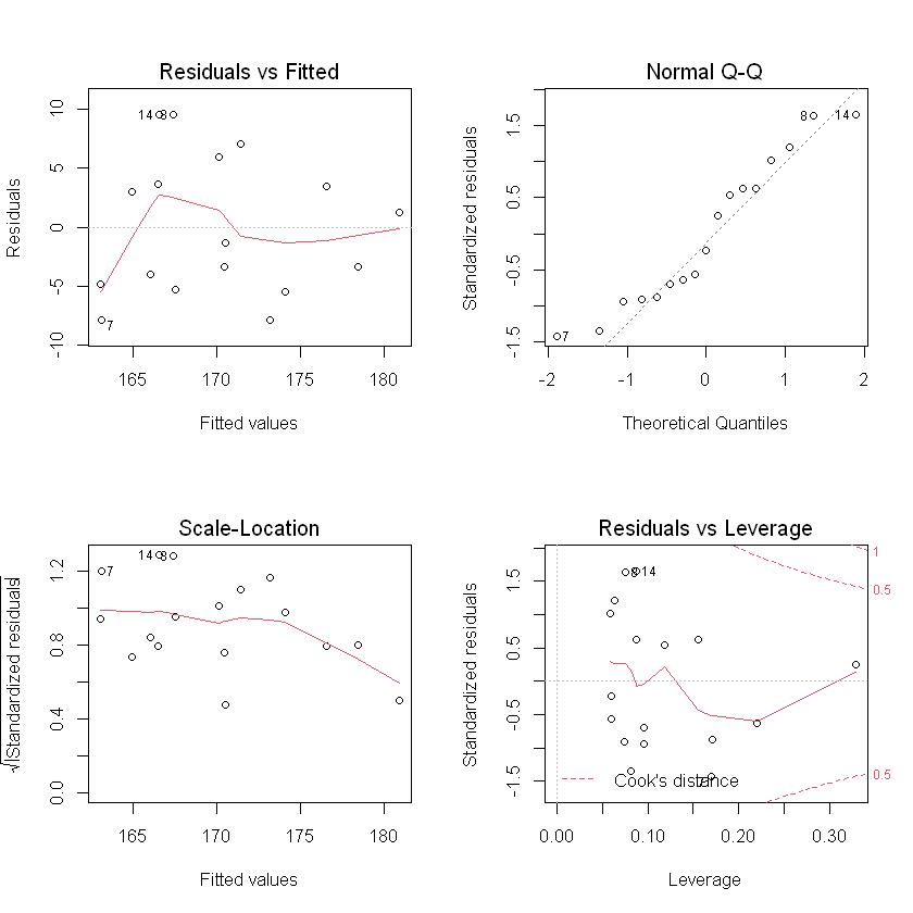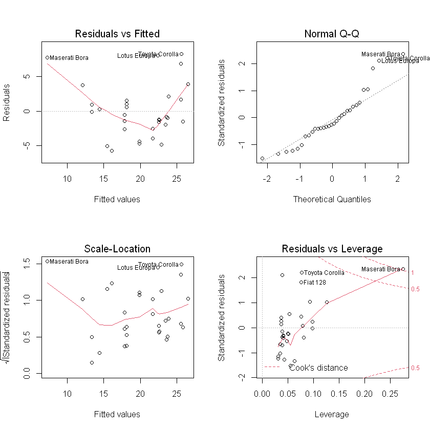 # 2 x 2 그래프 그리기 par(mfrow = c(2,2)) plot(Lm)