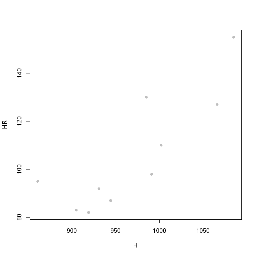 # 산점도 plot(HR~H, data = df, pch = 20, col = 'grey', cex = 1.5) # cex 점크기