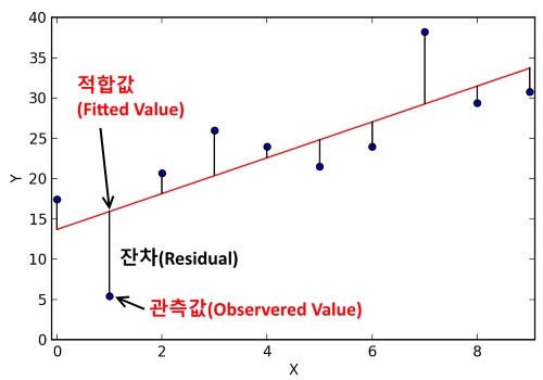 잔차: 회귀모델로부터 데이터가 떨어진 값