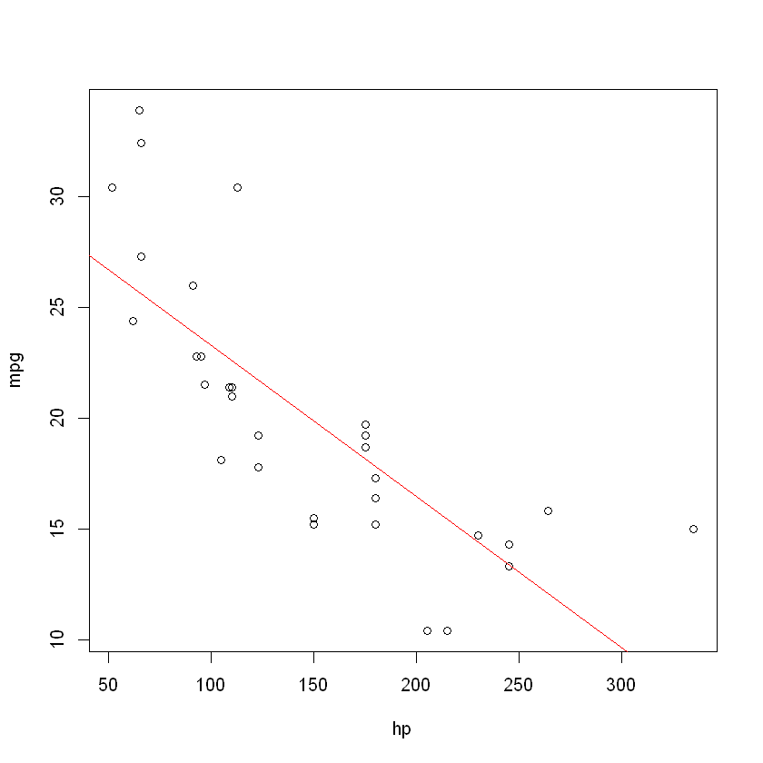 # 시각화 plot(mpg~hp, data = mtcars) # 회귀모델 구하기 Lm <- lm(mpg~hp, data = mtcars) abline(Lm, col='red')
