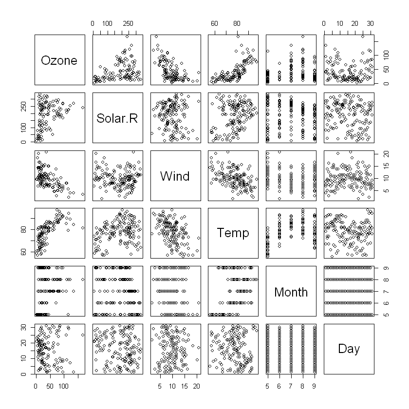 str(airquality)'data.frame': 153 obs. of 6 variables: $ Ozone : int 41 36 12 18 NA 28 23 19 8 NA ... $ Solar.R: int 190 118 149 313 NA NA 299 99 19 194 ... $ Wind : num 7.4 8 12.6 11.5 14.3 14.9 8.6 13.8 20.1 8.6 ... $ Temp : int 67 72 74 62 56 66 65 59 61 69 ... $ Month : int 5 5 5 5 5 5 5 5 5 5 ... $ Day : int 1 2 3 4 5 6 7 8 9 10 ...# 데이터 확인 head(airquality, 5)Ozone Solar.R Wind Temp Month Day <int> <int> <dbl> <int> <int> <int> 1 41 190 7.4 67 5 1 2 36 118 8.0 72 5 2 3 12 149 12.6 74 5 3 4 18 313 11.5 62 5 4 5 NA NA 14.3 56 5 5 # 변수간 관계 그리기 # Ozone과 Temp의 관계가 의미있어보임 plot(airquality)