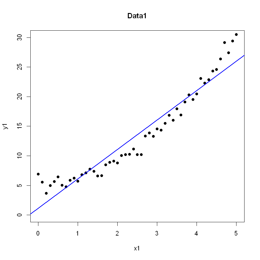 x2, y2의 관계도 # 회귀모델 그리기 y1,x1 plot(y1~x1, df, pch = 20, cex=1.5, ylim = c(0,30), main = 'Data1') abline(Lm.res1, col='blue', lwd=2) plot(y2~x2, df, pch = 20, cex=1.5, ylim = c(0,30), main = 'Data2') abline(Lm.res1, col='blue', lwd=2)