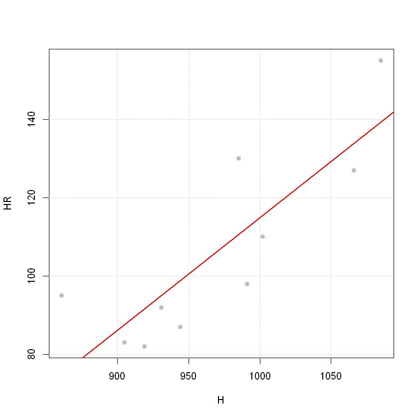 산점도 그래프 # 회귀모델 구하고 그리기 - 0.2871 안타 10번에 홈런 2.8번 LM <- lm(HR~H, data = df) LMCall: lm(formula = HR ~ H, data = df) Coefficients: (Intercept) H -172.3105 0.2871plot(HR~H, data = df, pch=20, col='grey', cex=1.5) grid() abline(LM, lwd=2, col='red')