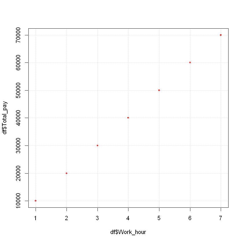 # 데이터로드 df <- data.frame(Work_hour=c(1:7), Total_pay=seq(10000,70000, by = 10000)) dfWork_hour Total_pay <int> <dbl> 1 10000 2 20000 3 30000 4 40000 5 50000 6 60000 7 70000 plot(data = df, df$Total_pay ~ df$Work_hour, pch = 20, col = 'red') grid()