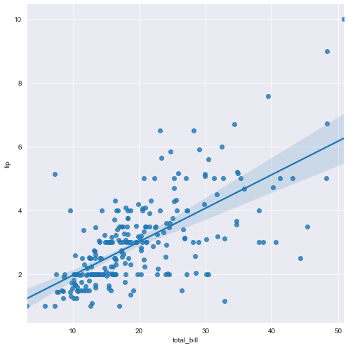 # https://stricky.tistory.com/124 sns.set_style("darkgrid") sns.lmplot(x="total_bill", y="tip", data=tips, size=7) plt.show()C:\ProgramData\Anaconda3\envs\r_study\lib\site-packages\seaborn\regression.py:573: UserWarning: The `size` parameter has been renamed to `height`; please update your code. warnings.warn(msg, UserWarning)