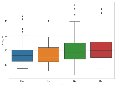plt.figure(figsize=(8, 6)) sns.boxplot(x = 'day', y='total_bill', data = tips) plt.show()