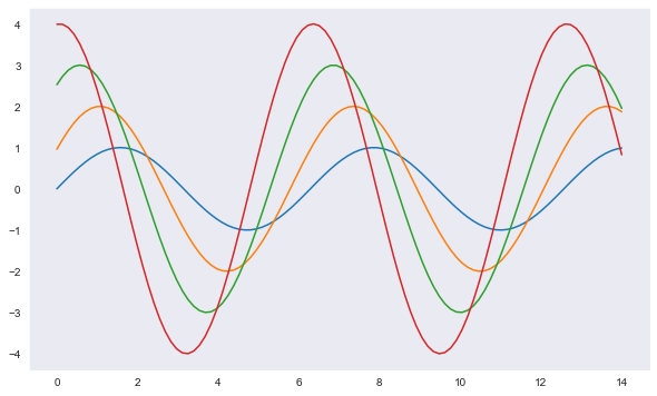 pip install seabornCollecting seaborn Downloading seaborn-0.10.1-py3-none-any.whl (215 kB) Requirement already satisfied: numpy>=1.13.3 in c:\programdata\anaconda3\envs\r_study\lib\site-packages (from seaborn) (1.19.0) Requirement already satisfied: pandas>=0.22.0 in c:\programdata\anaconda3\envs\r_study\lib\site-packages (from seaborn) (1.0.5) Collecting scipy>=1.0.1 Downloading scipy-1.5.1-cp37-cp37m-win_amd64.whl (31.2 MB) Requirement already satisfied: matplotlib>=2.1.2 in c:\programdata\anaconda3\envs\r_study\lib\site-packages (from seaborn) (3.3.0) Requirement already satisfied: pytz>=2017.2 in c:\programdata\anaconda3\envs\r_study\lib\site-packages (from pandas>=0.22.0->seaborn) (2020.1) Requirement already satisfied: python-dateutil>=2.6.1 in c:\programdata\anaconda3\envs\r_study\lib\site-packages (from pandas>=0.22.0->seaborn) (2.8.1) Requirement already satisfied: pillow>=6.2.0 in c:\programdata\anaconda3\envs\r_study\lib\site-packages (from matplotlib>=2.1.2->seaborn) (7.2.0) Requirement already satisfied: pyparsing!=2.0.4,!=2.1.2,!=2.1.6,>=2.0.3 in c:\programdata\anaconda3\envs\r_study\lib\site-packages (from matplotlib>=2.1.2->seaborn) (2.4.7) Requirement already satisfied: cycler>=0.10 in c:\programdata\anaconda3\envs\r_study\lib\site-packages (from matplotlib>=2.1.2->seaborn) (0.10.0) Requirement already satisfied: kiwisolver>=1.0.1 in c:\programdata\anaconda3\envs\r_study\lib\site-packages (from matplotlib>=2.1.2->seaborn) (1.2.0) Requirement already satisfied: six>=1.5 in c:\programdata\anaconda3\envs\r_study\lib\site-packages (from python-dateutil>=2.6.1->pandas>=0.22.0->seaborn) (1.15.0) Installing collected packages: scipy, seaborn Successfully installed scipy-1.5.1 seaborn-0.10.1 Note: you may need to restart the kernel to use updated packages.import matplotlib.pyplot as plt %matplotlib inline import seaborn as snsx = np.linspace(0, 14, 100) y1 = np.sin(x) y2 = 2*np.sin(x+0.5) y3 = 3*np.sin(x+1.0) y4 = 4*np.sin(x+1.5) plt.figure(figsize=(10, 6)) plt.plot(x,y1, x,y2, x,y3, x,y4) plt.show()