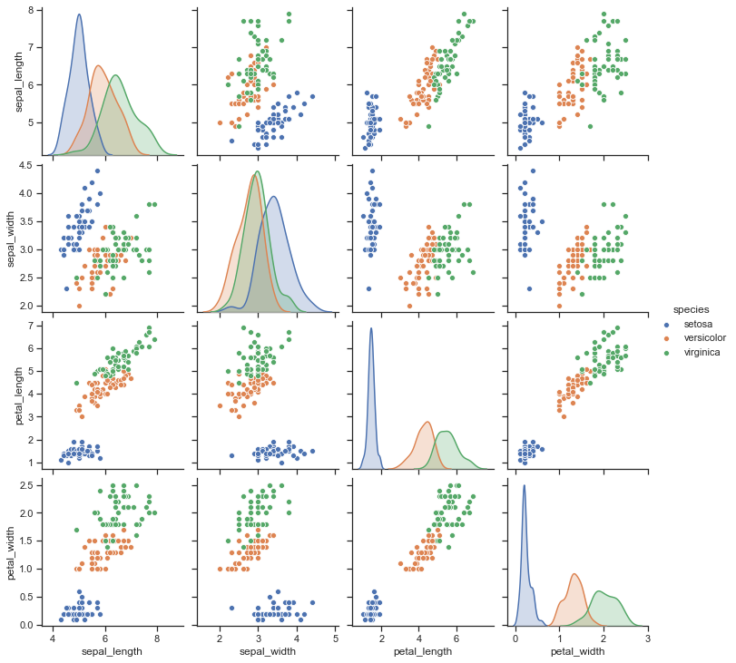 sns.pairplot(iris, hue="species") plt.show()