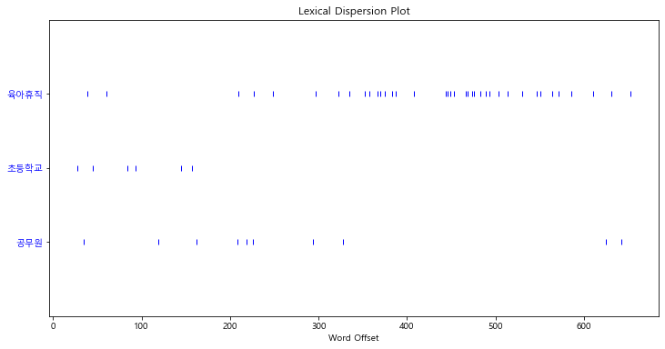 ko.count('초등학교')6plt.figure(figsize=(12, 6)) ko.dispersion_plot(['육아휴직', '초등학교', '공무원'])