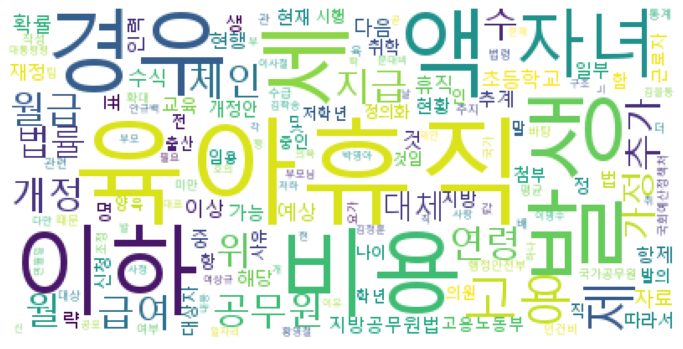 # 단어 주변부 확인 ko.concordance('초등학교')Displaying 6 of 6 matches: 안규백 황영철 박영아 김정훈 김학송 의원 인 제안 이유 및 내용 초등학교 저학년 경우 부모 사랑 필요 나이 현재 공무원 자녀 양육 위 육아 나이 현재 공무원 자녀 양육 위 육아휴직 수 자녀 나이 세 이하 초등학교 저학년 자녀 위 해당 부모님 일자리 곧 출산 의욕 저하 문제 수 일부 개정 법률 지방공무원법 일부 다음 개정 제 항제 중 세 이하 초등학교 취학 전 자녀 세 이하 취학 중인 경우 초등학교 학년 이하 말 자 항제 중 세 이하 초등학교 취학 전 자녀 세 이하 취학 중인 경우 초등학교 학년 이하 말 자녀 부 칙 법 공포 날 시행 신 구조 문대비 표 수 다만 제 경우 대통령령 정 사정 직 명 생 략 현행 세 이하 초등학교 취 세 이하 취학 중인 경우 학 전 자녀 양육 위 초등학교 학년 이하 초등학교 취 세 이하 취학 중인 경우 학 전 자녀 양육 위 초등학교 학년 이하 여 여자 공무원 말 자녀 임신 출산 때 생 략 생 략# 연이어 사용된 단어 확인 ko.collocations()초등학교 저학년; 근로자 육아휴직; 육아휴직 대상자; 공무원 육아휴직data = ko.vocab().most_common(150) # for window : font_path='c:/Windows/Fonts/malgun.ttf' # for mac : font_path='/Library/Fonts/AppleGothic.ttf' wordcloud = WordCloud(font_path='c:/Windows/Fonts/malgun.ttf', relative_scaling = 0.2, background_color = 'white', ).generate_from_frequencies(dict(data)) plt.figure(figsize=(12, 8)) plt.imshow(wordcloud) plt.axis('off') plt.show()