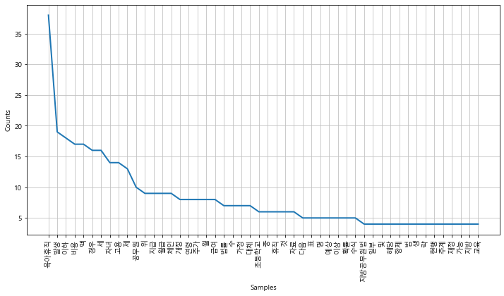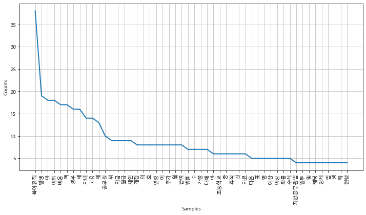 # 제외 문자 처리 stop_words = ['.', '(', ')', ',', "'", '%', '-', 'X', ').', '×','의','자','에','안','번', '호','을','이','다','만','로','가','를'] ko = [each_word for each_word in ko if each_word not in stop_words] #koko = nltk.Text(ko, name='대한민국 국회 의안 제 1809890호') plt.figure(figsize=(12, 6)) ko.plot(50) # Plot sorted frequency of top 50 tokens plt.show()